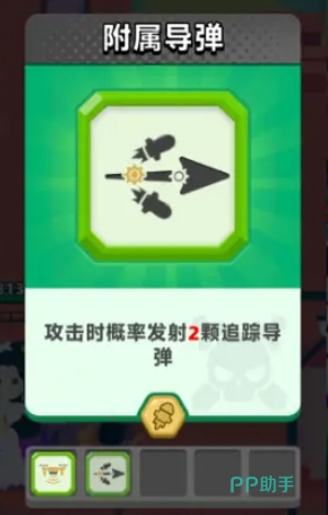 第二个技能的话点的就是附属导弹技能,附属导弹这个技能在攻击的时候是可以带来追踪导弹能力的,所以针对一些对boss输出的话,大家瞄准度不够的情况下就可以用这个技能,而且一次性释放的是两颗导弹,相对一些操作不太精准的玩家来说,其实这个技能还是比较有优势的,因为大家在这里对战,每一箭都是需要进行抛物线瞄准的,很多玩家在敌人波次比较快的时候,来不及瞄准可能就会发出很多的空箭,所以有这个附属导弹的自动追踪能力,大家就不用担心去加快瞄准速度。