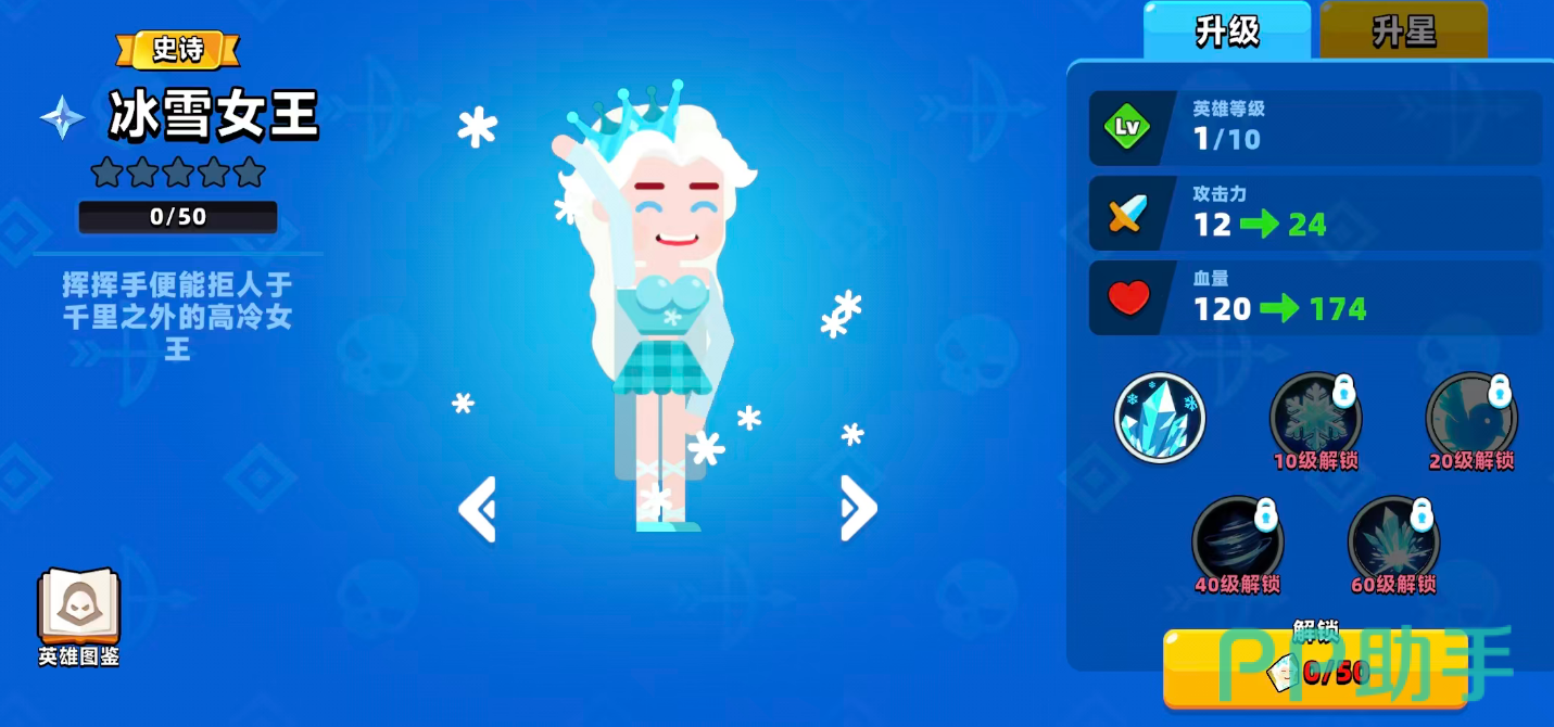 冰雪女王是一个史诗品质的英雄,目前在游戏中的技能有升星前的技能以及升星后的效果,第一个技能是冰雪魔法,使用的时候可以默认造成冰元素类型的伤害,而且使用这个技能会有很多的雪花特效,这个特效命中相应的地形时,会有一定的概率生成冰棱柱,然后在这里造成的是范围伤害效果,另外的冰霜亲和技能是在10级的时候解锁的技能,在上面带来的效果是让所有冰元素类型的伤害都带来微幅提升的数值效果,第三个技能是在20级的时候解锁的寒冰生命,使用这个技能的时候会间歇性的召唤冰鸟出来,这些冰鸟的数量前期比较少,但是会直接飞向最近的一波敌人,对这些敌人都造成伤害之外,还可以施加冻结的效果,影响他们前进的速度。