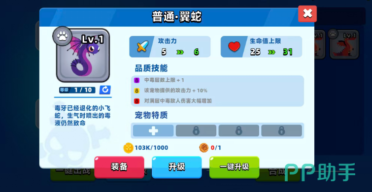 翼蛇:很适合放在毒系流派里面使用的宠物,还长了翅膀可以移动到敌人身边攻击,基础带来的技能效果就有中毒层数上限+1的提升,技能给宠物自己带来的提升则是提供的攻击力增加10%的数值,最后达到最高品质的时候是可以对满层中毒的敌人带来伤害大幅增加的增益效果,所以跟毒系流派的技能搭配在一起才可以达到这个宠物的最大化攻击效果。