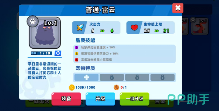 雷云:外观看起来是一朵黑灰色的云,基础的攻击不算高,但是技能效果可以让玩家的弹药回复速度提升10%的速度,所以要是想要走速攻的话其实也可以考虑这个宠物,还有一个增益是可以让宠物本身的攻击力+10%,且在品质上升之后雷云的攻击间隔还会有一定幅度的降低,所以搭配雷系的话也可以让整体流派的输出速度加快很多。