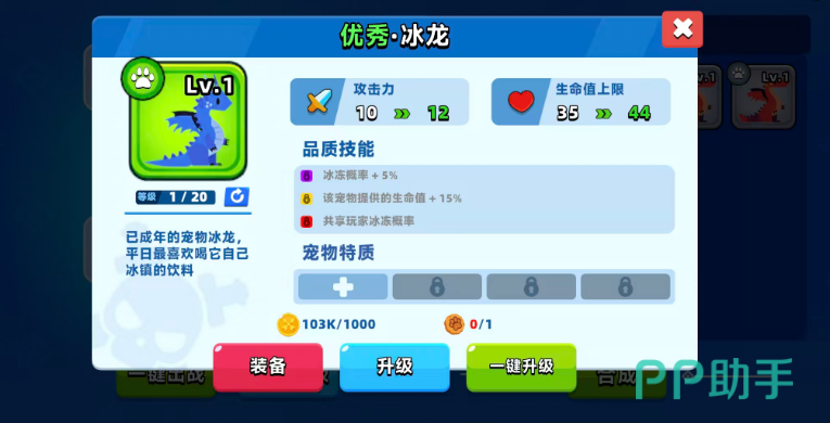 然后给大家推荐的还有冰龙,比较适合冰系用的一个宠物,技能当中中可以提升冰冻概率+ 5%的数值,还有给宠物自身会带来生命值+15%的增益,玩冰系推荐这个宠物的原因其实就是因为冰龙可以共享玩家冰冻概率,所以搭配在一起可以造成冻结敌人更多次的情况。