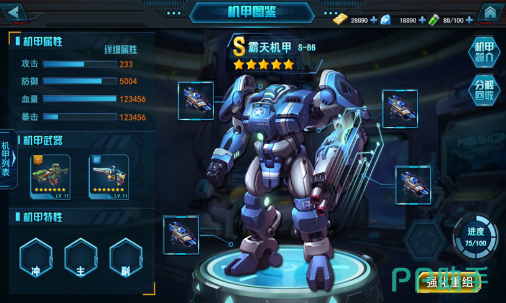 游戏里会有大量不同的机甲,每一个机甲角色的名称,属性以及战斗能力都是不一样的,这些机甲的左臂会被设计成枪械,可以直接控制机甲,挥舞手臂进行射击,根据机甲的特性以及枪械的类型不一样,产生的弹幕特效也会各有不同,需要合理利用每一个机甲的能力,不断向对手发动进攻。