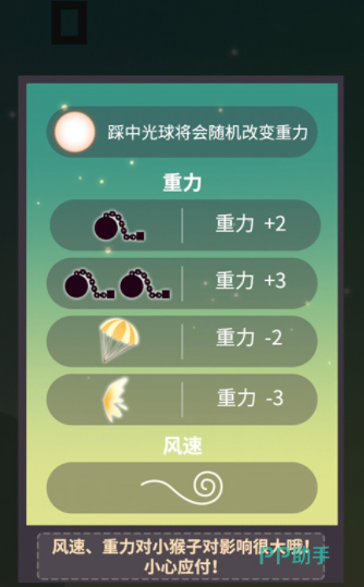 除了传统的跳跃设定之外,游戏里还会有很多高难度的玩法设定,就比如在有一些场景区域中,会增加风速和重力的相关设定,这些设定会直接影响在跳跃过程中,玩家松手的时机,要合理利用游戏里的降落伞,铁球或者是翅膀,让角色在场景里快速下落,也可以用这些道具延长猴子的落地时间,通过这种方式有助于猴子精准的落到平台上。
