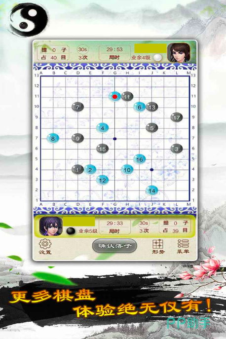 将国风特色结合制其中,打造出古香古色的围棋棋盘,游戏中的棋盘皮肤多达15种,从万菊棋盘到星辰棋盘,玩家可以自由选择,开启不一样的视觉体验。棋子更是做到黑白分明,在棋子的立体和圆润度上,也通过专业建模技术完成还原。