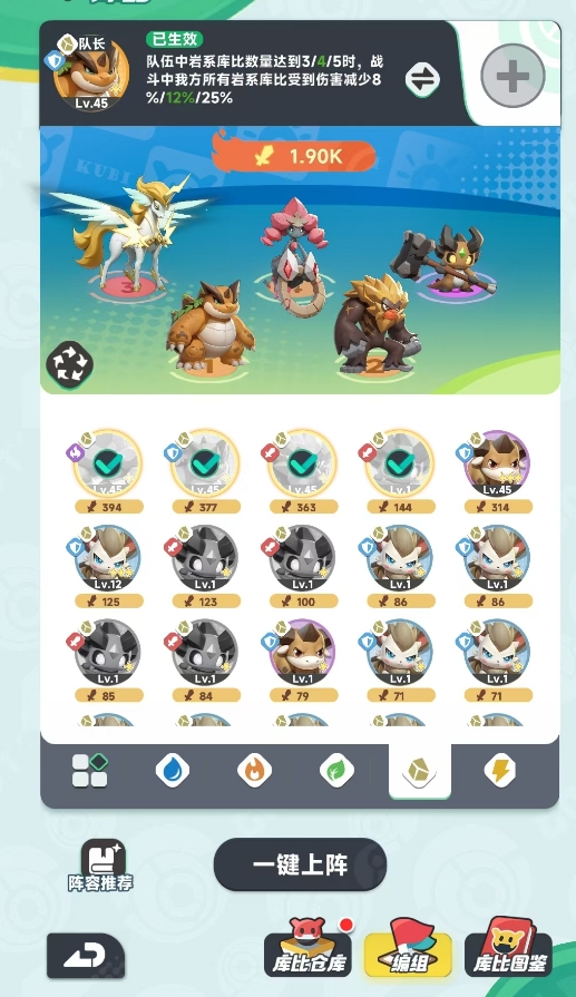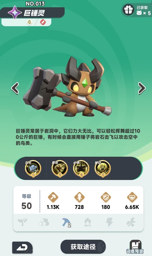 在各位集齐一定数量的岩系橙宠,且它们的星级都提升上去后,就需要逐渐更换掉前期配队中的紫色宠物,转变为以橙宠为主的的中期岩系队,既菇隆隆、坚甲龟、珑美尔、阿泰罗和巨锤灵。在更换时,优先用珑美尔将非岩系宠物替换掉,若有坚甲龟则先把岩角牛换了。