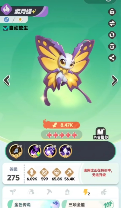 紫月蝶这只库比可以说是每位玩家人手一只,因为它在新手期间你就可以遇到,在地图上随便一抓就能够获得,相当的容易。而在仔细研究它的技能之后,玩家们也可以发现这绝对是一支非常值得培养的库比,首先就是它的被动技能,能够让自己以最快的速度恢复能量,因此小伙伴们也会发现紫月蝶的大招cd是相当之短。在大招满级之后,伤害更是达到了514倍率,和朱雀相比只低了5点。