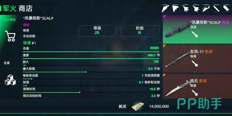 在选择具体型号时,务必关注导弹的速度参数与攻击范围指标,比如备受推崇的鹰12A导弹,这个导弹的打击能力绝对会让大家印象深刻,尤其是背身攻击时的高额伤害输出,并且一次齐射可发射两颗导弹,还有海科导弹,其创新设计的可变弹道让敌人难以捉摸飞行轨迹,在对空作战中能起到出色的干扰作用,也可以用来打乱敌方部署。