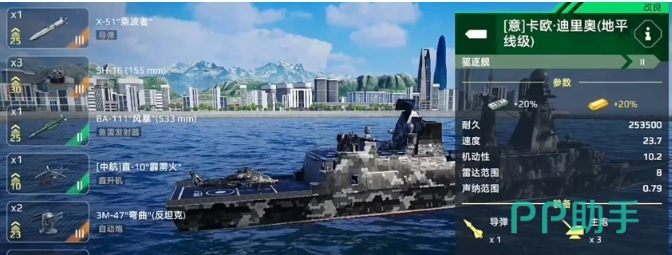 关于金条的使用,同样有着明确的优先级排序,首要之务是购买性能不错的地平线级驱逐舰,剩余的金条则应合理投入到解锁ASW反潜火箭和鱼鹰直升机上,可使大家的反潜效率提升30%,然后新手时期可以用PC3飓风号,有6连发的火力可以实现贴脸秒脆皮的效果,加之35节的高航速,使其在战斗中能够打完就跑,若搭配独特的卡山战术,即巧妙地躲在山体后方发动突然袭击,那么在单人局中,它的刷钱效率绝对一流。