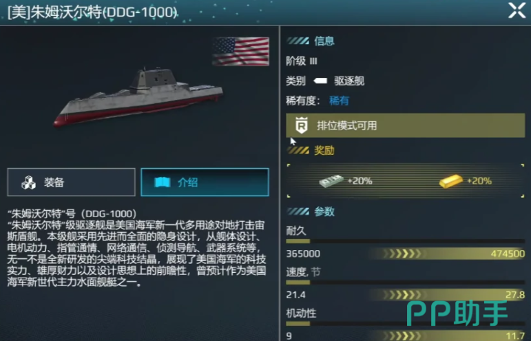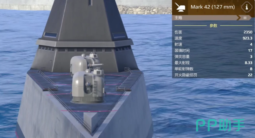 主炮用127的MARK42,再看它的机动性和雷达探测能力,这两项指标均达到了游戏内的顶尖水准,高达32.5节的航速使它在海面上飞驰,而10.4千米的广阔雷达覆盖范围则让它拥有敏锐的战场洞察力,一旦战斗进入白热化阶段,经验丰富的舰长便可充分利用其高机动性施展灵活多变的游走战术,精准打击敌方的核心战舰,逐步瓦解对方的防御体系,不过过高的机动性也使得朱姆沃尔特号在高速行进间极易暴露自身防空薄弱的缺点,此时就需要玩家凭借精湛的操作技巧,进行尾部转向,以规避敌方密集的防空火力。