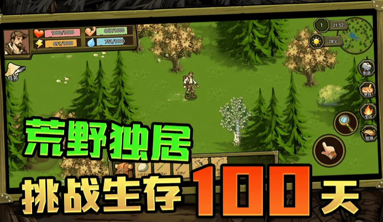 游戏里健健康值以及口渴饥饿程度,都直接用数字的形式展现了出来,玩家需要时刻关注这些数字,这样才能让角色随时补充能量,维持角色的生命健康,在荒野探索的时候会有一些大型的野生动物穿梭其中,玩家需要小心躲避,避免受到这些野生动物的攻击,随着时间的推移,昼夜还会在游戏里不断交替变化,这会让玩家感觉很有代入感,好像真的来到了野外。