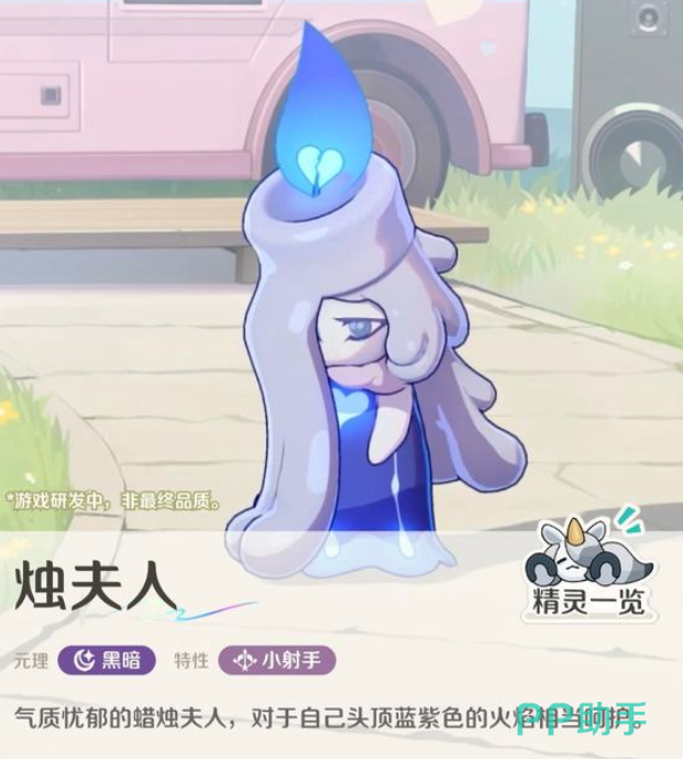 如果大家在游戏当中获取了烛夫人这个精灵的话,其实关于她的外观上面看是非常能够很快辨别出来的,因为她的外观上面就是一个蜡烛一样的形态,这个烛夫人把她辨别为女性精灵的话,上面的蜡烛滴落下来的形状就特别像头发,而且在游戏当中,因为她的元理是黑暗属性的,所以在整体表现上面也是表现的气质比较忧郁,当然最独特的是她头上的火焰散发着蓝紫色的光芒,这种特效跟她的后期特性也有一定相关联的地方。