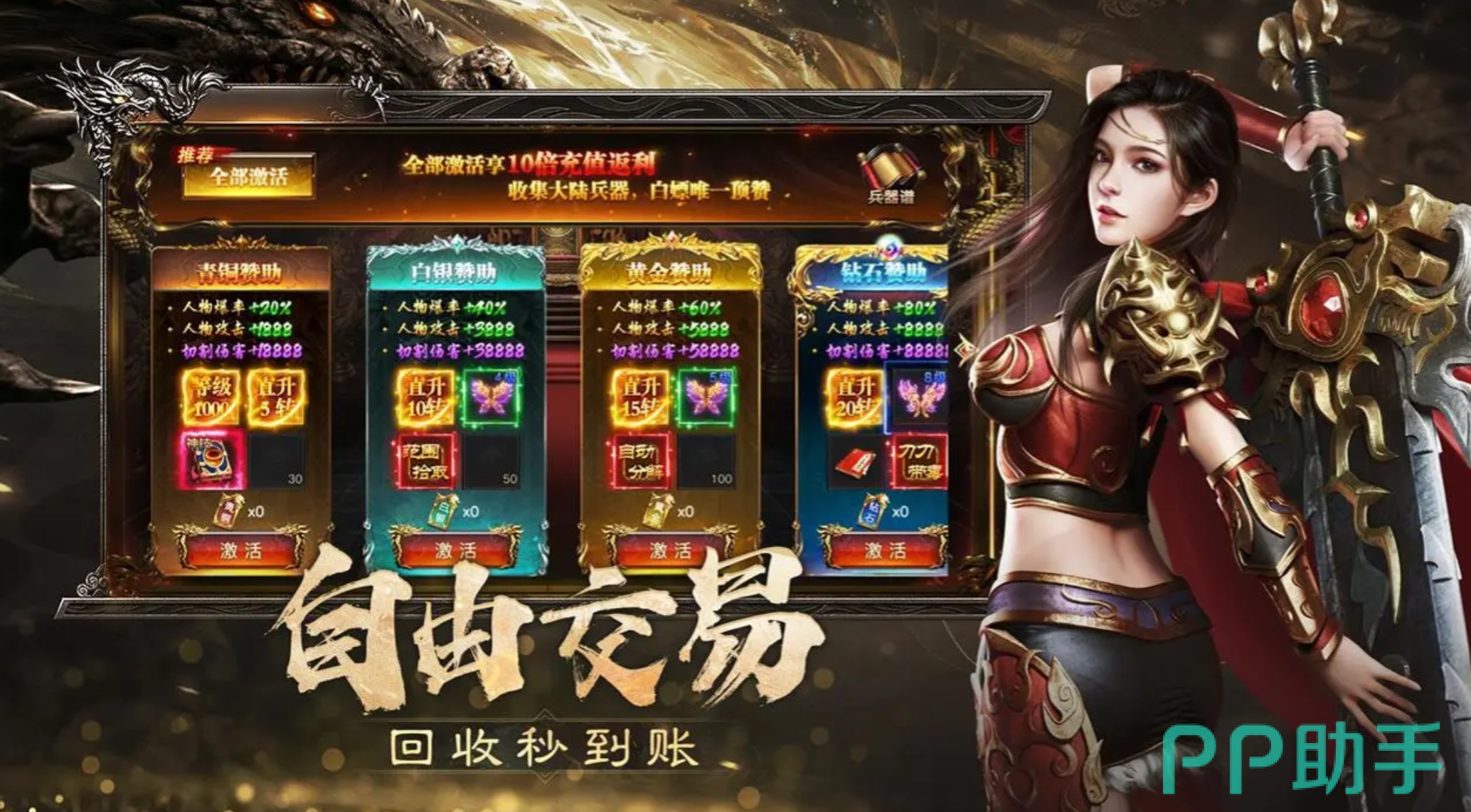 待各位将练度提升至一定程度后,还可在烈焰觉醒里开启修仙玩法,通过提升境界来获取更多的战力加成,也能解锁更多的大陆地图,去与那些更具挑战性的怪物进行战斗。此外,所有的野外地图均能通过开红来与他人进行PVP,同时游戏也在开放了沙城等众多可让各位获得高额回报的PVP玩法,并且它们只要参与就能拿到保底的PVP收益,即便各位不想去争夺名次,也最好在开放时过去参与一下,至少让自己的拿到保底。而在这些PVP活动里获胜的伙伴更是能拿到幻化武器等超稀有装备,它们的特效也相当拉风。