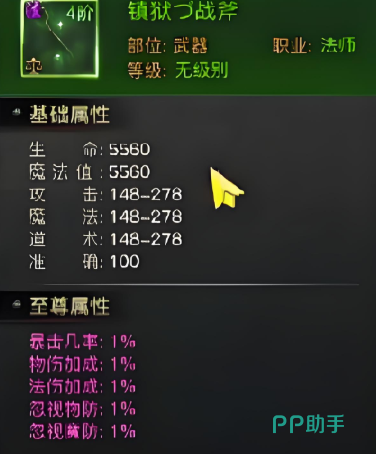 其次如果大家玩的是法师这个职业的话,推荐的武器大家要选择一些比较容易上手的武器,因为法师在整体的操作强度上面比较强,这里推荐的武器叫做镇狱战斧,这个武器也是比较容易上手的一个武器,而且武器本身的,魔法数值以及生命数值都是非常高的,所以使用这个武器的话,大家不用担心自己的血量出现问题,后期这个武器在升级了之后,还有一定的暴几率可以进行提升,提升的数值也可以达到4%的数值,在新手阶段的话使用这个武器带来的暴击力提升其实绝对是够用了,如果此时大家去刷图的时候遇到的群怪比较多的话,也可以利用这个技能武器效果打出更多的暴击。