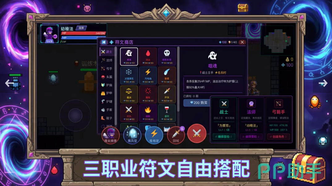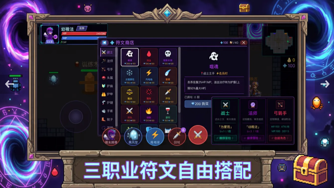 游戏里会打造一个暗黑场景,玩家可以选择一个喜欢的职业,进入暗黑像素世界开启冒险,游戏里职业不同,对战特性也有所区别,喜欢战斗的可以选弓箭手角色,利用自身的爆发输出,完成游戏对战,假如玩家喜欢元素伤害或者是控制,可以选择法师路线,没有任何游戏经验的成员,建议选择战士路线,自身的战斗力比较优秀,并且拥有一定防御能力,选择完角色之后即可开启地下城冒险,挑战过程中角色会设定多种技能,玩家通过不同的技能组合,可以打出高额伤害。